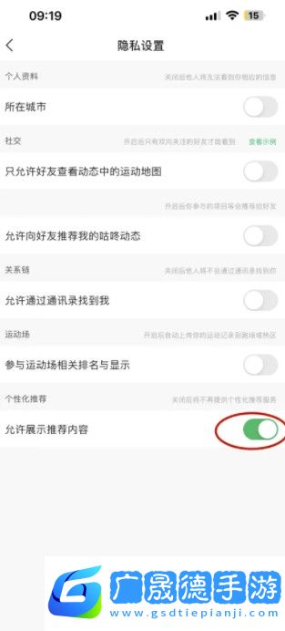 第三步:在隱私設置頁面,把【允許展現推薦內容】選項關閉即可,如圖所示。