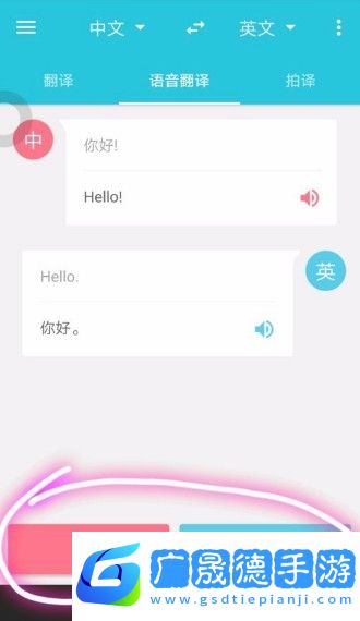 選擇后,界面下方顯示語言鍵,例如中文英文互譯,就會出現中文,英文,按住中文說一句話,就自動翻譯成英文