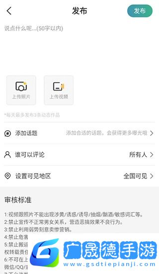 小編選擇的是個(gè)人簡(jiǎn)介,進(jìn)入之后需要填寫自己的個(gè)人信息,照片或者視頻,還能添加話題和選擇可見內(nèi)容,但是視頻發(fā)布需要注意下方的規(guī)則哦!不合規(guī)的視頻是無法發(fā)布的!