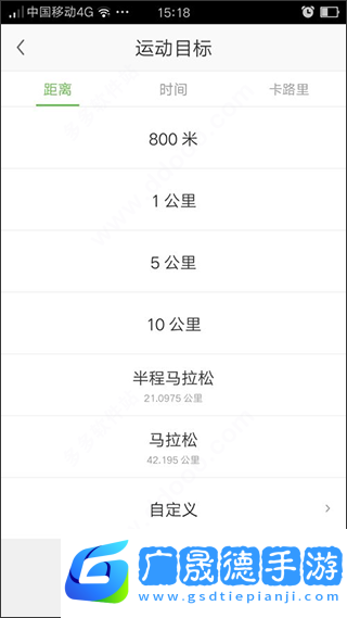 3、在制定好訓練計劃后,我們再往右滑動到第三頁面進行當前運動目標的設定,點擊進去后可以看到三個分類,分別是距離、時間、卡路里,這個時候我們就要根據自身當前所需去選擇什么樣的運動目標了,如跑步5公里、減脂600大卡、運動時間為2小時等。