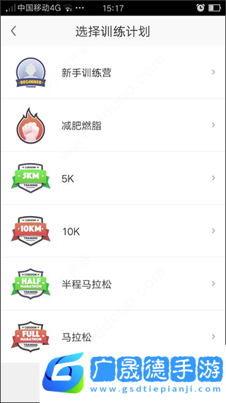 2、登錄進咕咚的主界面后,我們會看到多種多樣的選項,但是我們并不要著急地去點開它們,要一步一步地去設置才能更好的完成我們鍛煉的定制,首先我們來到“運動”選項這里,劃到第二頁,進行訓練計劃的制定,一共有六種訓練強度,分別是新手訓練營、減肥燃脂等逐步遞增,我們需選擇適宜自身情況的情況進行參與,并設定參與的時間。